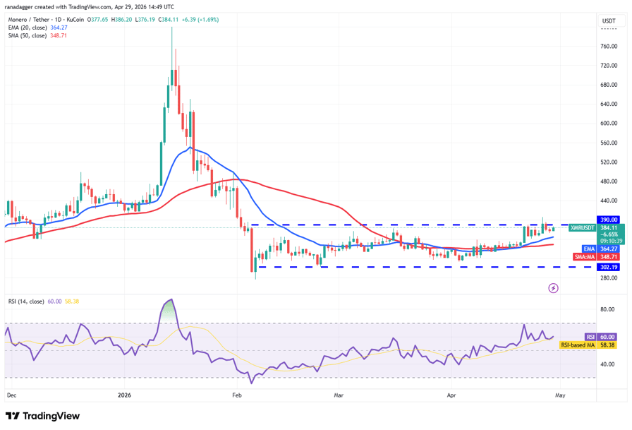 تراجع سعر XMR مرة أخرى إلى المتوسط المتحرك الأسي على مدى 20 يومًا (364 دولارًا)، حيث تدخل المشترون. إذا استمر زوج XMR/USDT في الارتفاع واخترق مستوى 406 دولارات، فهذا يشير إلى بداية حركة صعودية جديدة نحو 500 دولار.
