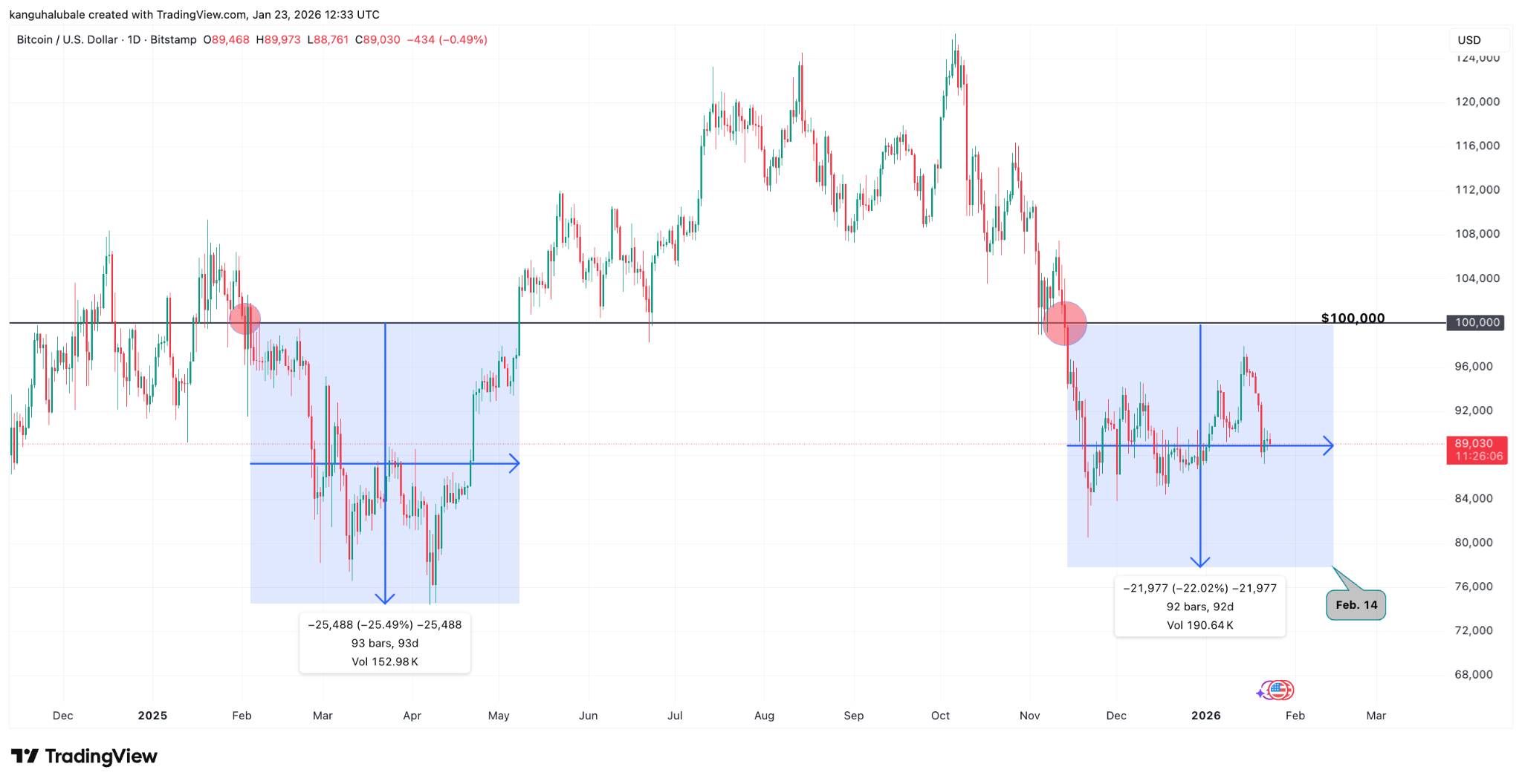 في المرة الأخيرة التي انخفض فيها سعر BTC/USD إلى ما دون 100000 دولار، استعاد المستوى بعد 93 يومًا بعد انخفاض بنسبة 25.5٪.