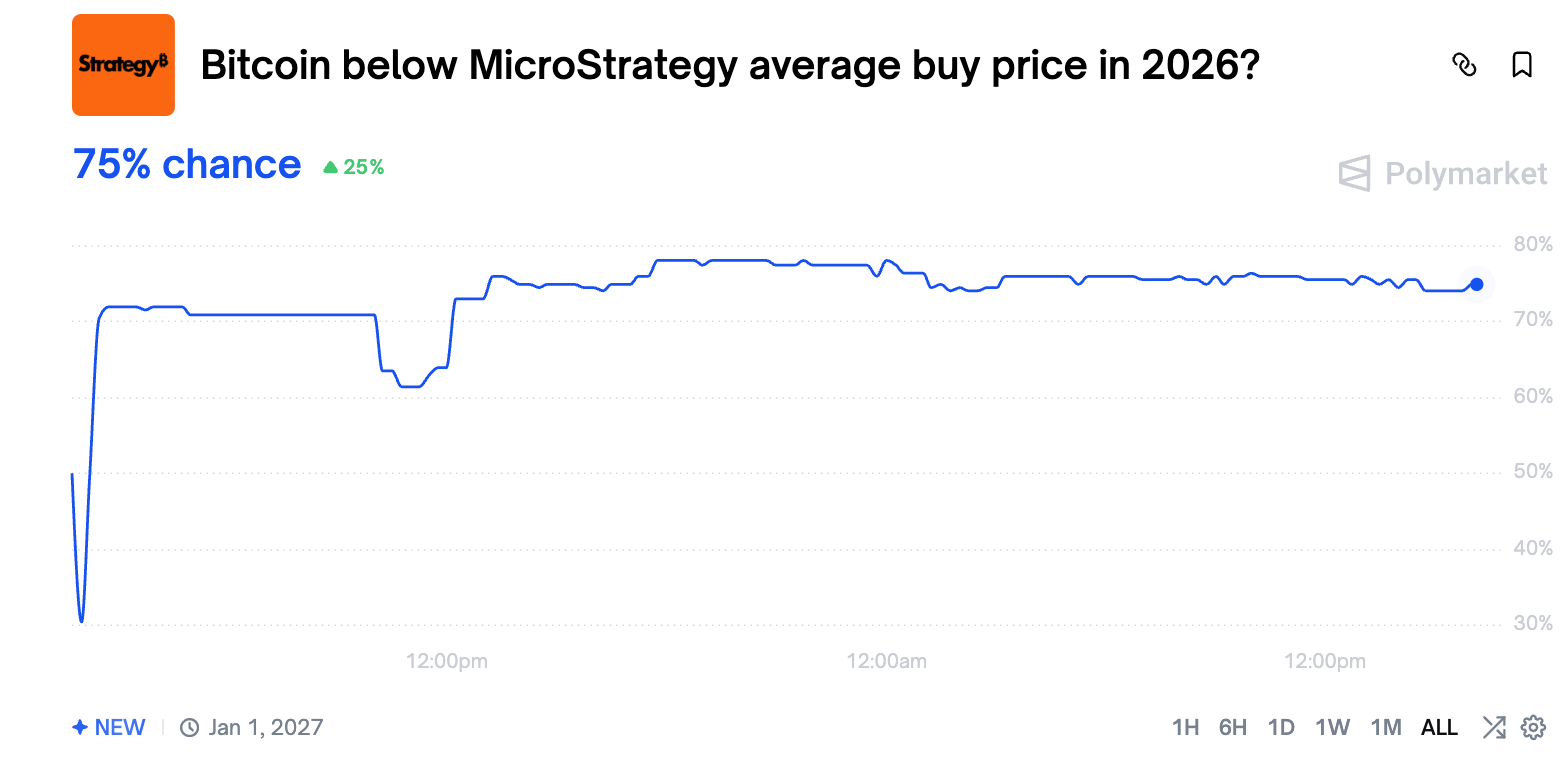 حدد المتداولون في Polymarket فرصة بنسبة 75% لتداول عملة البيتكوين بأقل من متوسط سعر تكلفة البيتكوين في الإستراتيجية في عام 2026، والذي يبلغ 75,979 دولارًا في وقت كتابة هذا التقرير.