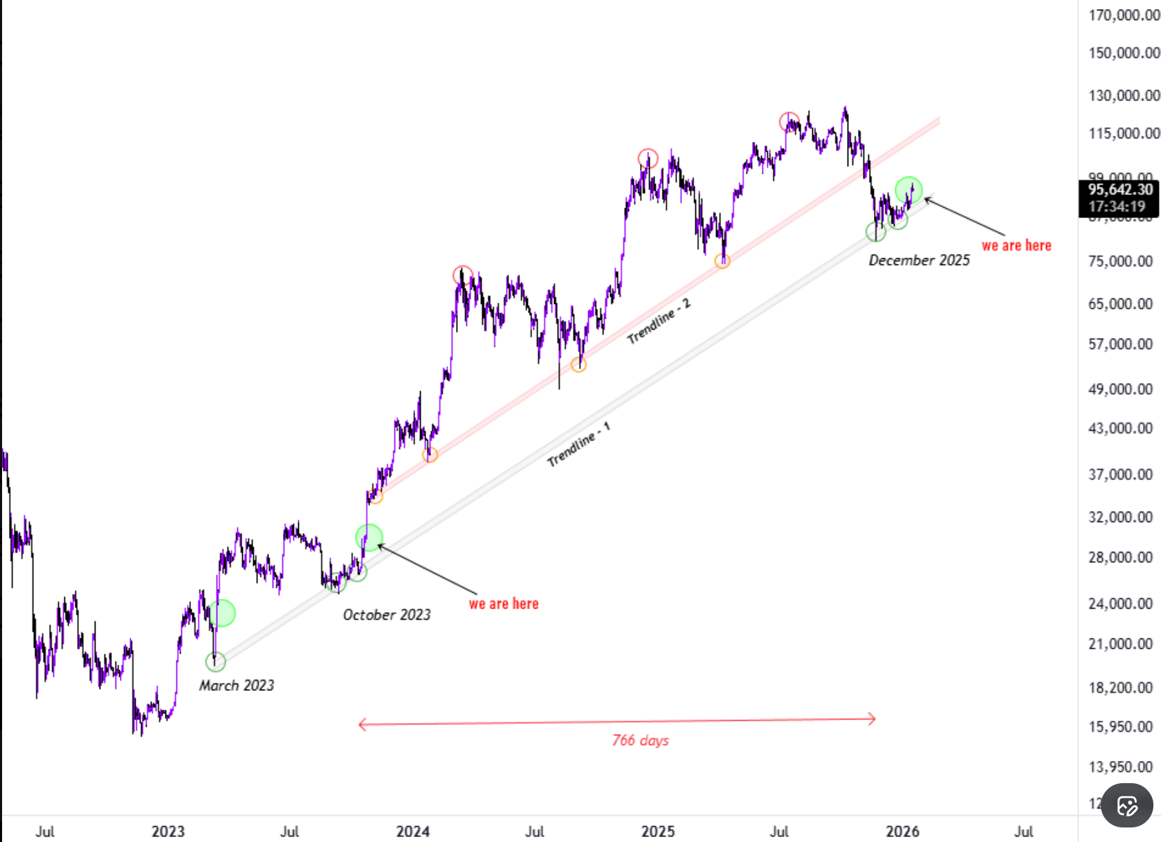 وقال ماجز في أحدث تحليل له على X: “إن عملة البيتكوين تنتعش من دعم خط الاتجاه طويل المدى الذي ظلت تحتفظ به منذ مارس ٢٠٢٣”، مضيفًا: