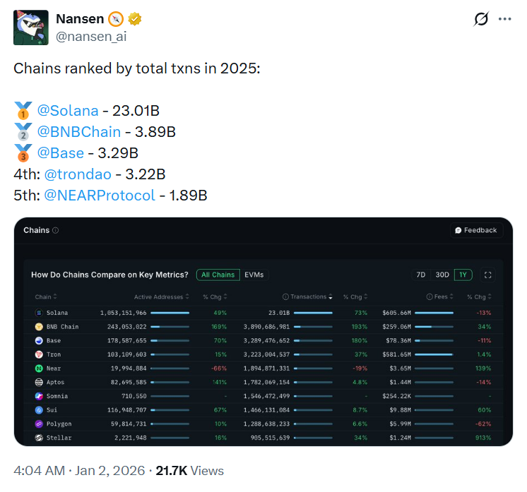 كانت سلسلة BNB واحدة من أكثر سلاسل الكتل ازدحامًا في عام 2025 من حيث حجم المعاملات ونشاط المستخدم، حيث احتلت المرتبة الثانية بعد Solana من حيث إجمالي معاملات onchain، مع تسجيل حوالي 3.89 مليار معاملة في عام 2025.