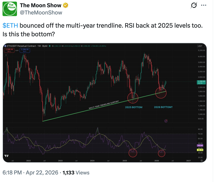 ترتد الأثير حاليًا من خط اتجاه متعدد السنوات والذي حدد تاريخيًا قيعان أسعار ETH الكلية. أدت الحالات السابقة في أبريل 2025 ومنتصف 2022 إلى ارتفاع أسعار إيثريوم بنسبة 260% و130% على التوالي.