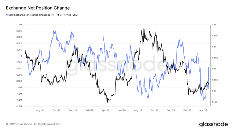 ويظهر هذا أيضًا في زيادة تدفقات البورصة إلى الخارج، حيث انخفض صافي تغير مركز إيثريوم بين البورصات خلال الثلاثين يومًا الماضية بمقدار 1.4 مليون إيثريوم في 2 أبريل، وهو ما يمثل أكبر ارتفاع في سبعة أشهر، وفقًا لبيانات غلاسنود.