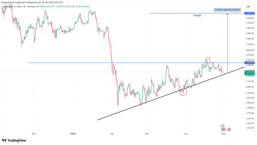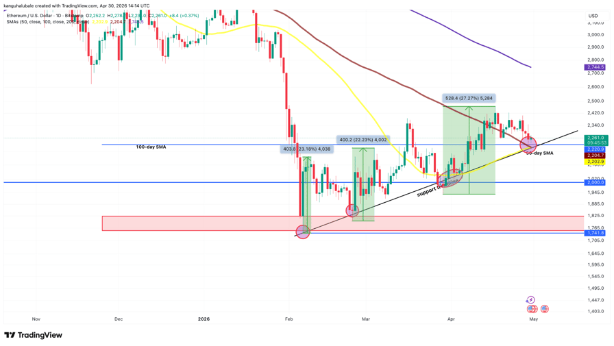 الأثير (إيثريوم) بأكثر من 25٪ من أدنى مستوى له في فبراير دون 1800 دولار، ويشير مزيج من الإشارات الفنية وإشارات onchain إلى أن التعافي قد لا يزال لديه مجال أكبر للاستمرار في مايو.