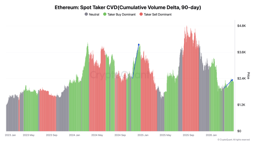 يُظهر دلتا الحجم التراكمي (CVD) لـ Ether لمدة 90 يومًا أن أوامر الشراء (شراء الشراء) أصبحت مهيمنة مرة أخرى. يقيس CVD الفرق بين حجم الشراء والبيع على مدى ثلاثة أشهر.