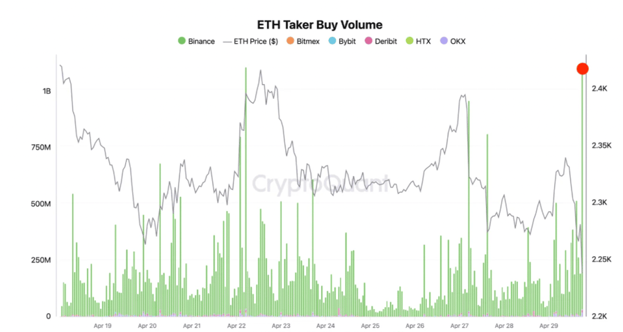 وفي الوقت نفسه، قفز حجم شراء إيثريوم إلى أكثر من مليار دولار يوم الأربعاء، مما يشير إلى أن المضاربين على الصعود استفادوا من الانخفاض إلى أقل من ٢٣٠٠ دولار لشراء المزيد، حسبما تظهر بيانات من كريبتوكوانت.