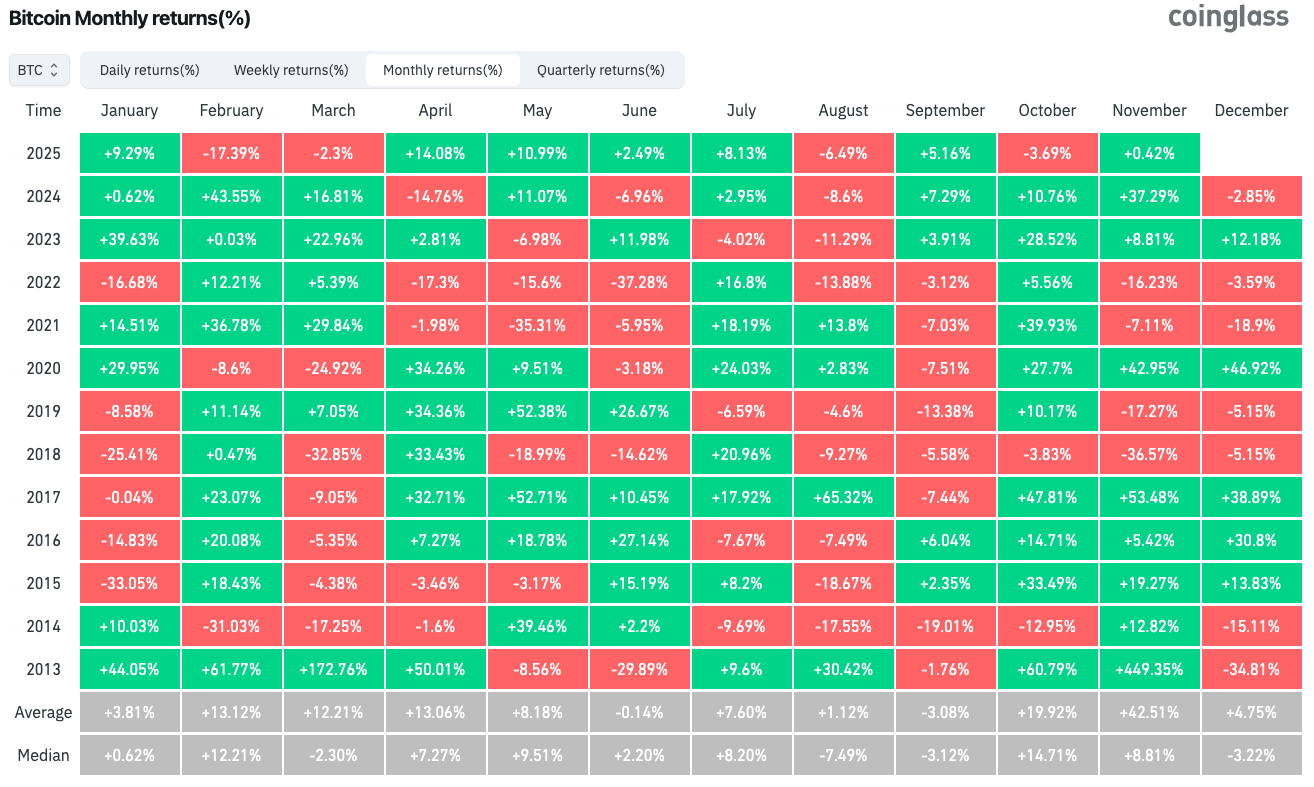 وحسبما أفاد كوينتيليغراف، فإن شهر نوفمبر هو تقليديًا الشهر الأفضل أداءً لبيتكوين، حيث تؤكد بيانات من كوين جلاس متوسط ارتفاع ضخم بنسبة ٤٢,٥٪ منذ عام ٢٠١٣.