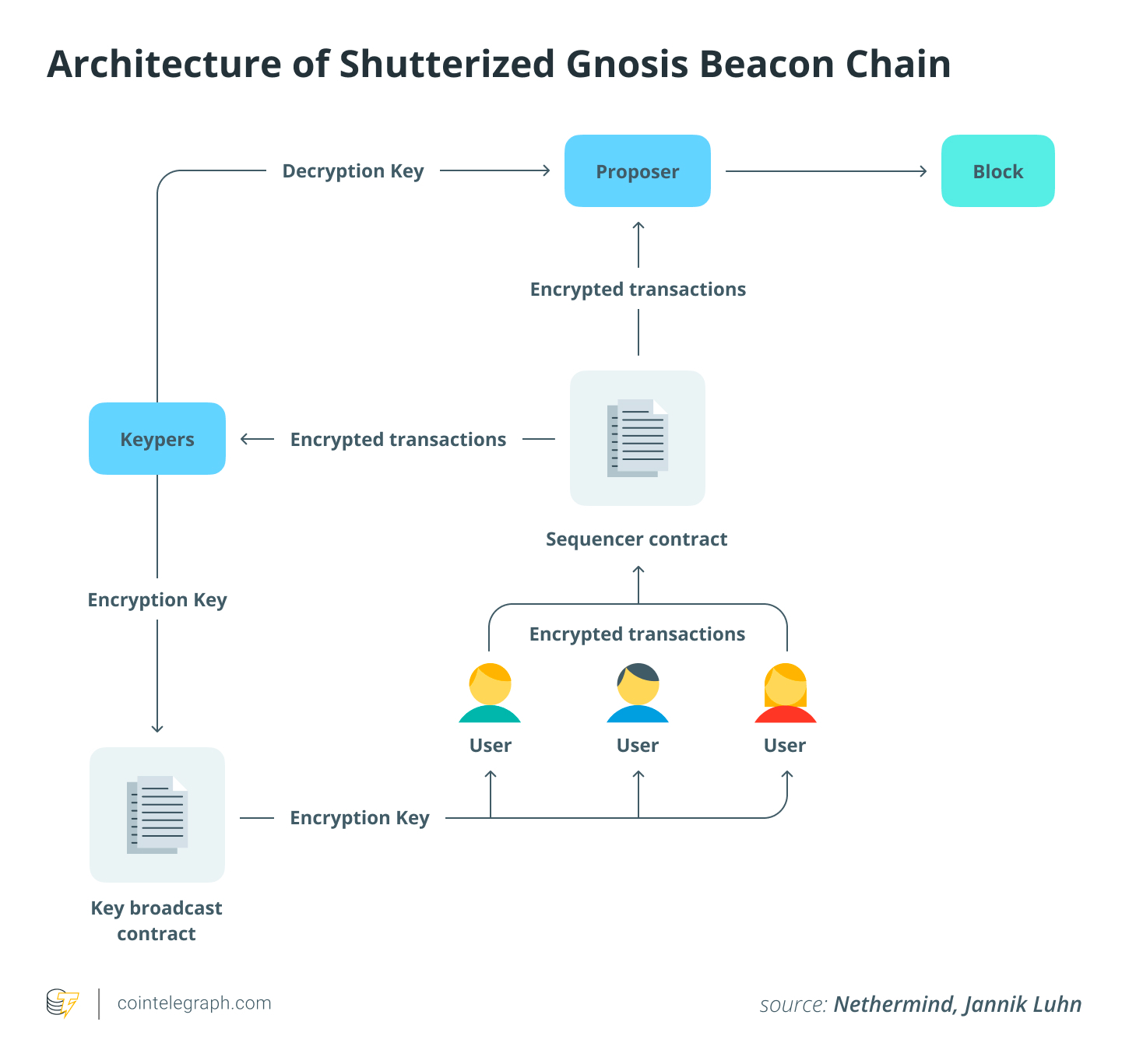 تعمل لجنة العتبة كخدمة خارجية تعمل إلى جانب blockchain. يجعل هذا التصميم إجماعًا غير مؤلف ، مما يعني أنه يمكن استخدامه على معظم blockchains دون الحاجة إلى تغيير قواعد الإجماع. ومع ذلك ، من المهم أن تضع في اعتبارك أنه على عكس مجموعة المدقق ، عادة ما تكون اللجنة هيكلًا مُذوقًا بشكل صارم يجب الوثوق به. في الغالق ، يتم اختيار أعضاء اللجنة ، ما يسمى Keypers ، من قبل حوكمة البروتوكول.