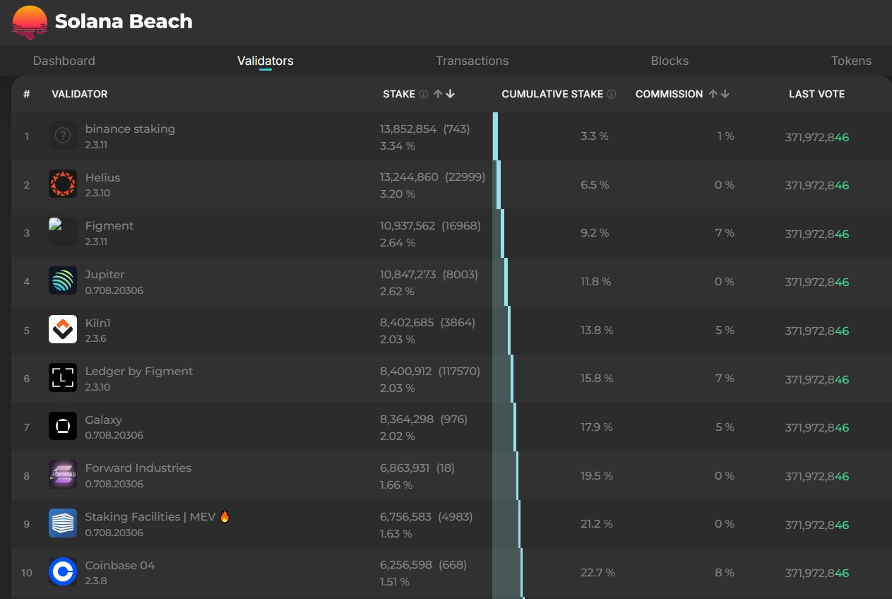وفقًا لـ Solana Beach ، فإن أكبر صحة Solana هم Binance Staking و Helius و Figment و Coupter.