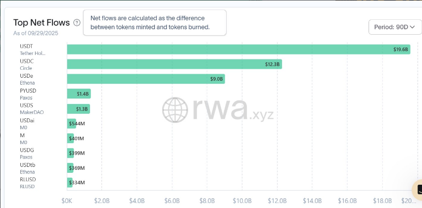 على الرغم من المنافسة المتزايدة ، تواصل USDT من Tether (USDT) و Circle’s USDC (USDC) قيادة السوق. سجلت USDT 19.6 مليار دولار من التدفقات الصافية خلال الربع الثالث ، تليها USDC بمبلغ 12.3 مليار دولار وإيثينا USDE مع 9 مليارات دولار ، وفقا لبيانات الصناعة.
