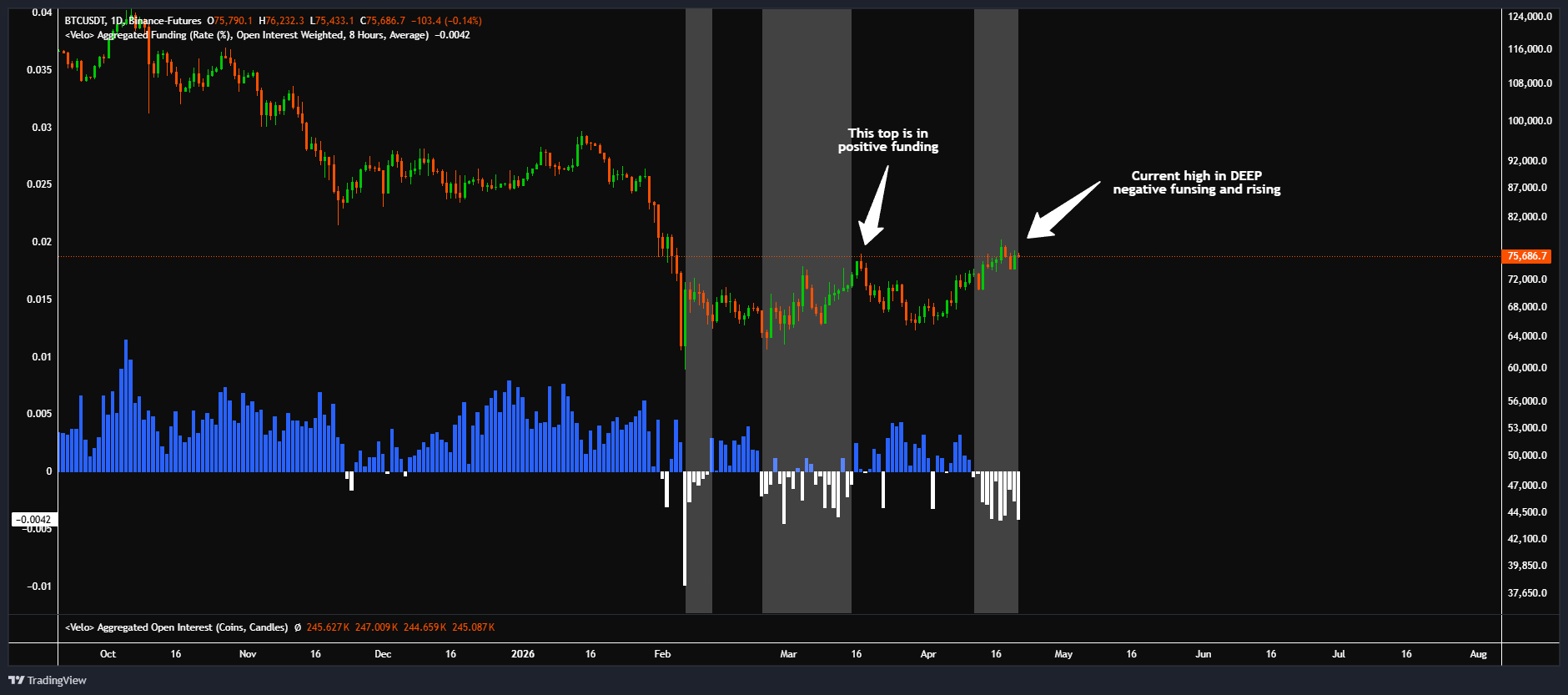 “لم نحصل أبدًا على واحدة عندما كان الرسم البياني في حالة تدهور. أبدًا. لقد حدث ذلك فقط خلال القاع المحلي،” أشار المتداول Osemka على X إلى جانب الرسوم البيانية التي تظهر فترات التمويل السلبية السابقة.