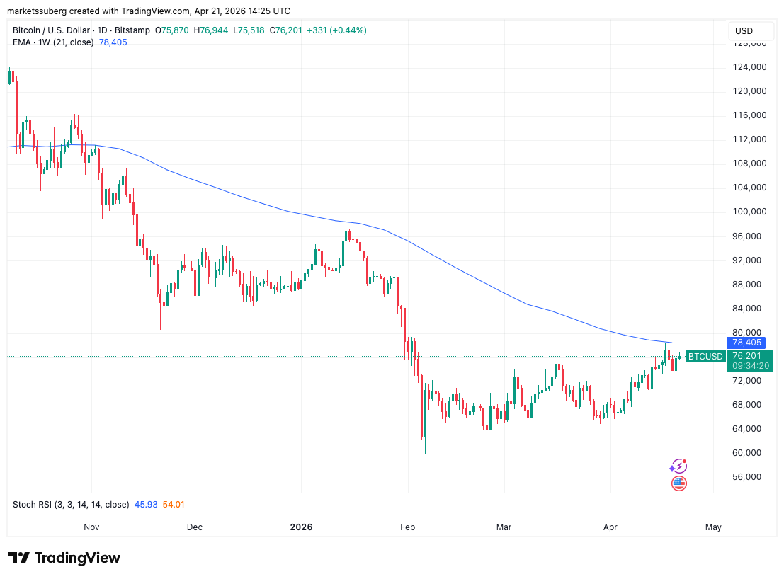 لا يزال المضاربون على صعود البيتكوين بحاجة إلى تجاوز خط الاتجاه القريب لمدة 21 أسبوعًا للحفاظ على السعر ثابتًا منذ أكتوبر 2025.