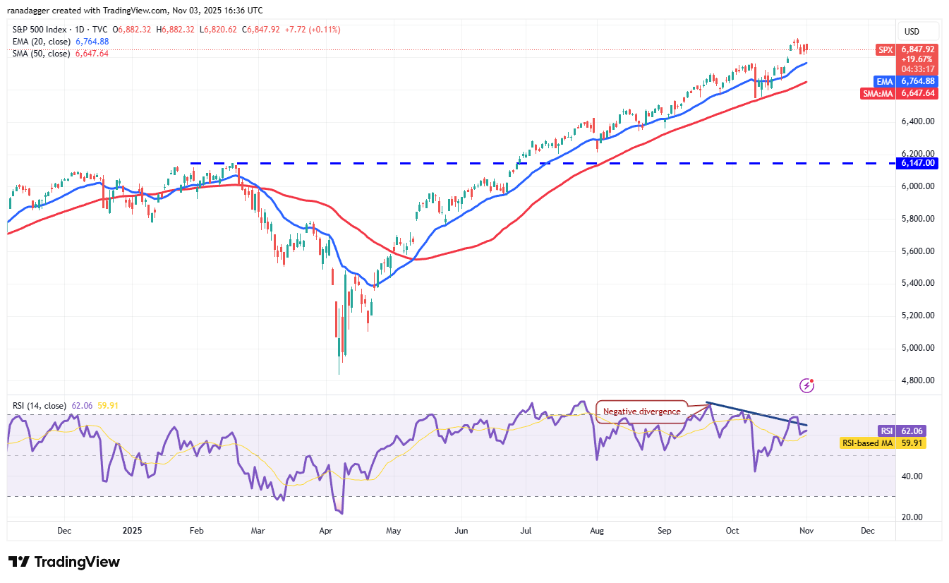 لا يزال مؤشر S&P 500 (SPX) في اتجاه صعودي؛ ومع ذلك، فإن التباعد السلبي على مؤشر القوة النسبية (RSI) يشير إلى أن الزخم الصعودي قد يضعف.