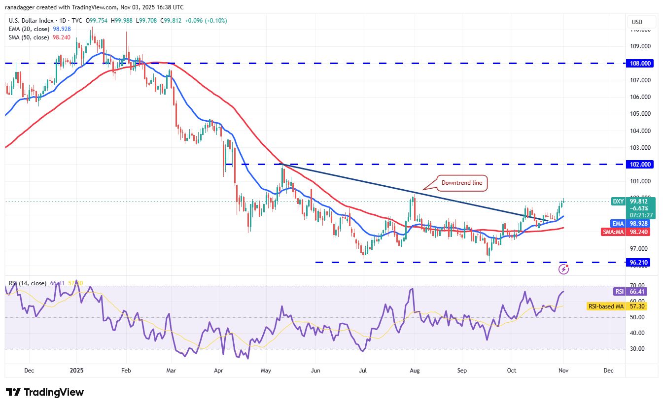 ارتد مؤشر الدولار الأمريكي (DXY) من المتوسط المتحرك الأسي على مدى 20 يومًا (98.92) يوم الأربعاء، مما يشير إلى معنويات إيجابية.