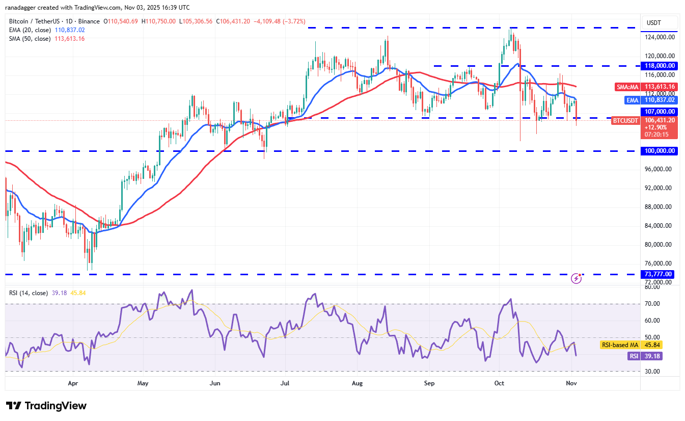 بعد الأداء السيئ في أكتوبر، فشلت بيتكوين (BTC) في تغيير مسارها. بدأت BTC الشهر الجديد بانخفاض إلى مستوى الدعم الحاسم عند 107000 دولار، مما يشير إلى أن المضاربين على الانخفاض يحاولون السيطرة.