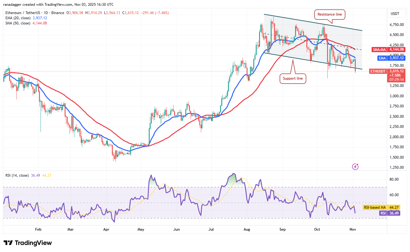 تراجعت عملة إيثريوم (ETH) من المتوسط المتحرك الأسي على مدى ٢٠ يومًا (٣٩٣٧ دولارًا) وانكسرت دون خط الدعم لنمط القناة الهابطة يوم الاثنين.