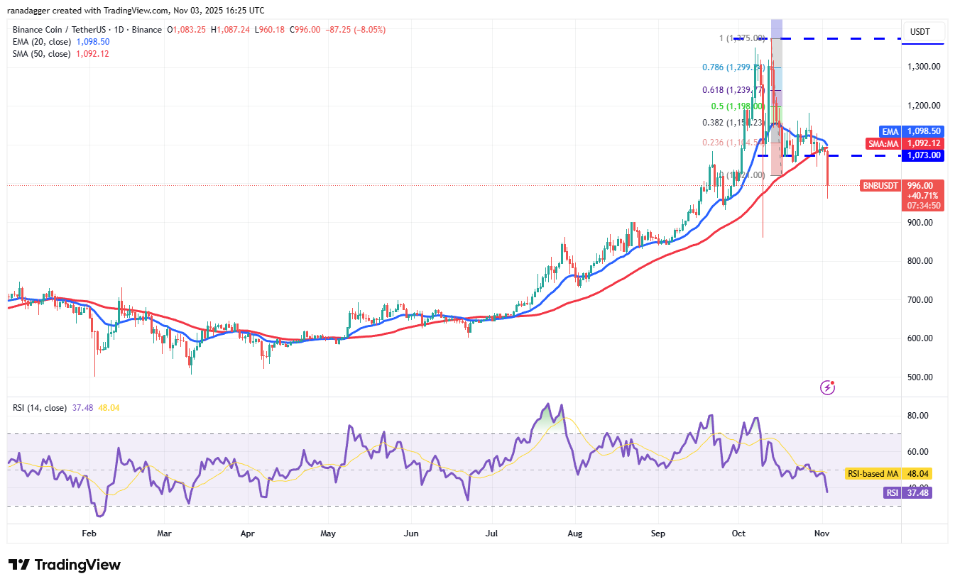 أغلقت عملة BNB (BNB) دون المتوسط المتحرك البسيط لمدة 50 يومًا (1,092 دولارًا) يوم الأحد، وتكثفت عمليات البيع يوم الاثنين.