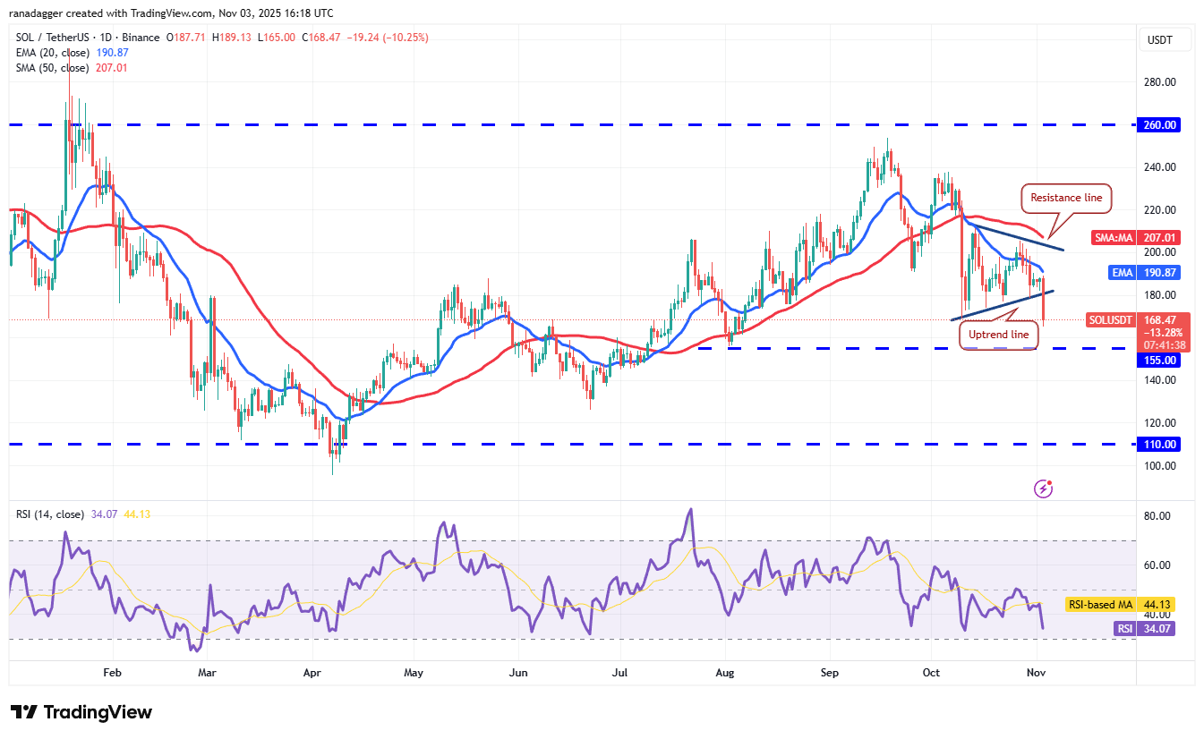 يمكن أن يتراجع زوج SOL/USDT إلى مستوى الدعم القوي عند 155 دولارًا. من المرجح أن يواجه أي ارتداد عن مستوى 155 دولارًا عمليات بيع عند المتوسط المتحرك الأسي البالغ 20 يومًا (190 دولارًا). إذا حدث ذلك، فإن سعر سولانا قد ينخفض إلى 137 دولارًا.