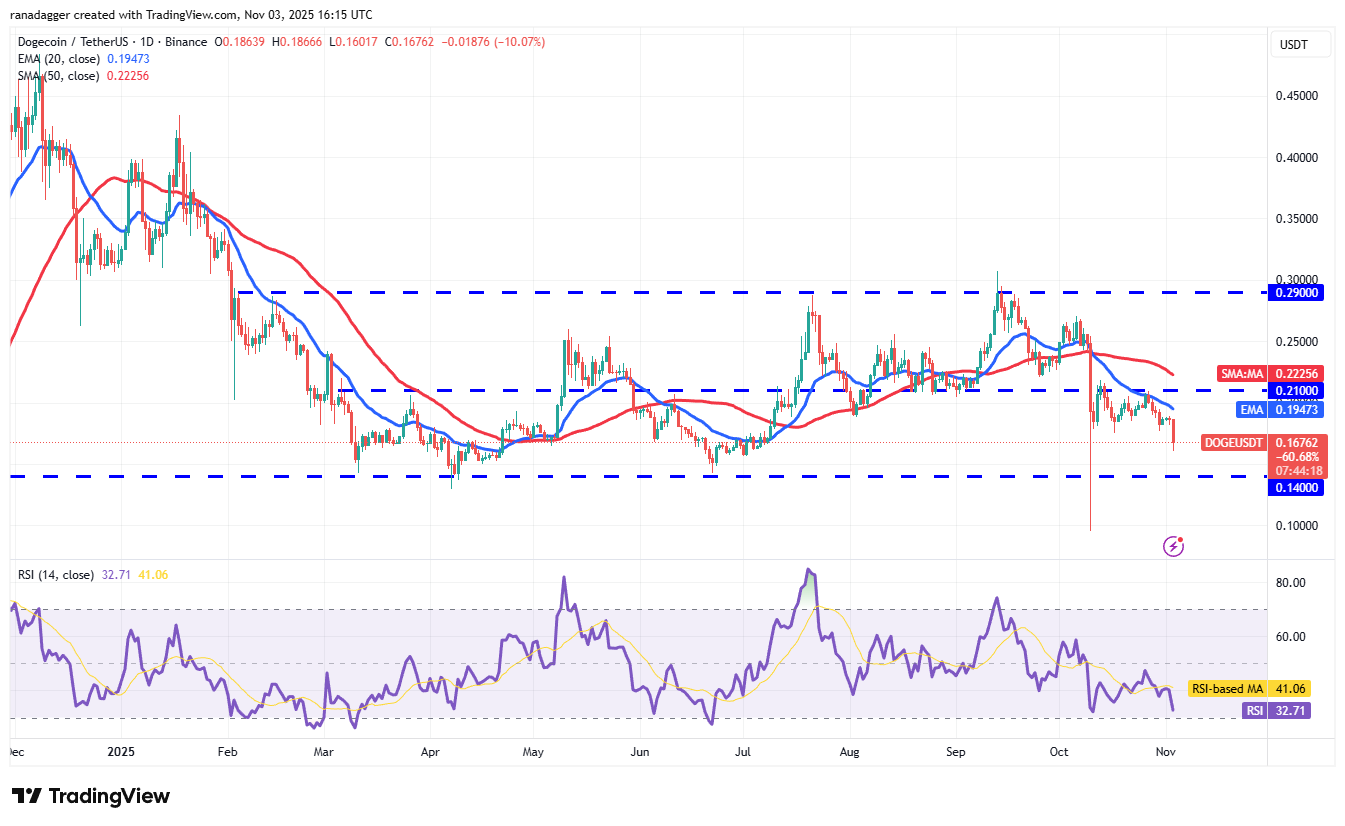 من المرجح أن ينخفض زوج DOGE/USDT إلى مستوى الدعم القوي عند 0.14 دولار، والذي من المتوقع أن يجذب المشترين. إذا ارتد السعر عن مستوى الدعم البالغ 0.14 دولار وارتفع فوق المتوسطات المتحركة، فهذا يشير إلى أن الحركة المحددة بالنطاق قد تستمر لبعض الوقت.