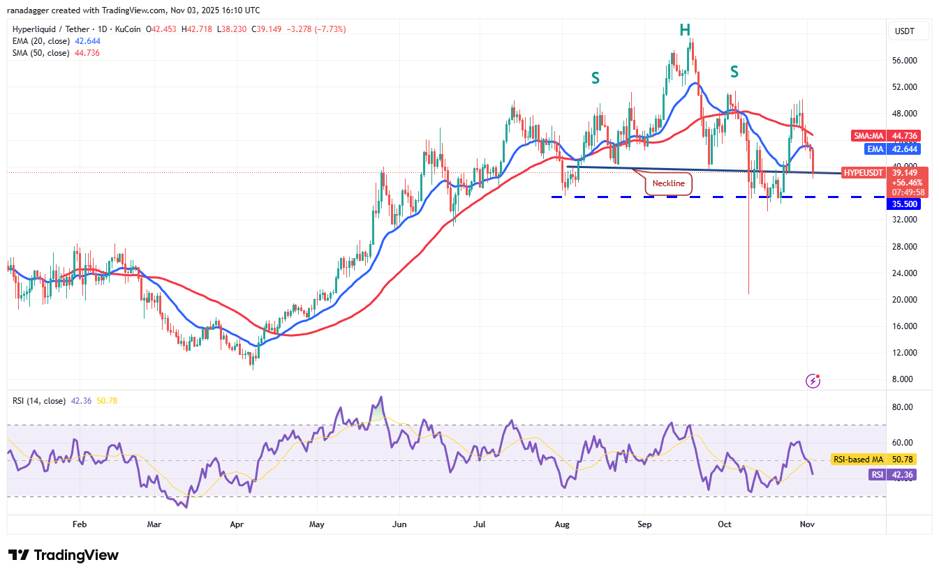 انخفض زوج HYPE/USDT إلى خط العنق ويمكن أن يمتد الانخفاض إلى مستوى الدعم القوي عند 35.50 دولارًا. من المتوقع أن يقوم المشترون بحماية مستوى 35.50 دولارًا بقوة، حيث أن الاختراق تحته قد يؤدي إلى تسريع عمليات البيع. يمكن أن ينهار سعر Hyperliquid بعد ذلك إلى 30.50 دولارًا ثم إلى 28 دولارًا لاحقًا.