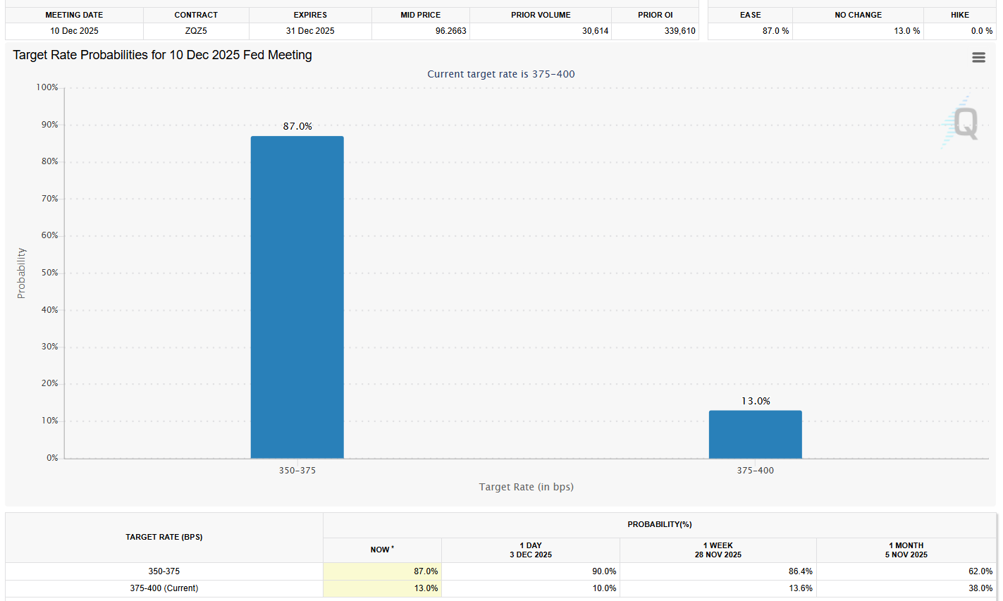 تتوقع الأسواق فرصة بنسبة 87% لخفض سعر الفائدة بمقدار 25 نقطة أساس، ارتفاعًا من 62% قبل شهر، وفقًا لأداة FedWatch التابعة لمجموعة CME.
