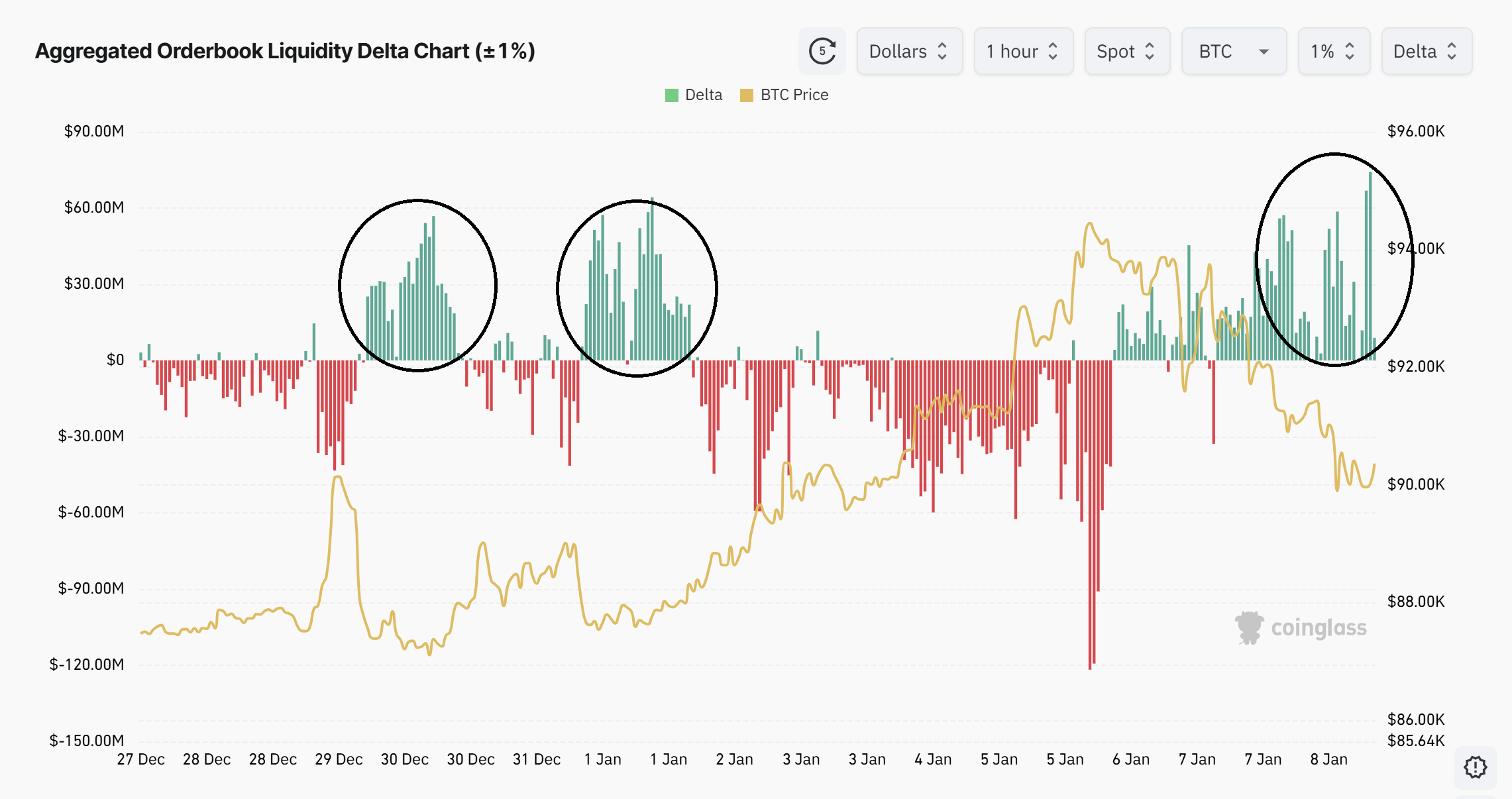 تُظهر البيانات من CoinGlass أن دلتا سيولة دفتر الطلبات المجمعة تقدم عروض أسعار سلبية قوية تبلغ حوالي 90,000 دولار. على مدى الأسبوعين الماضيين، سبق استيعاب عروض مماثلة حالات انتعاش قصيرة الأجل، وهو نمط يمكن أن يتكرر إذا استمر المشترون في الدفاع عن هذه المنطقة.