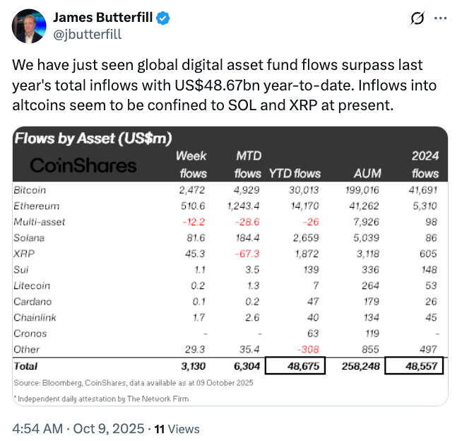 اجتذبت منتجات العملات المشفرة العالمية المتداولة في البورصة (ETPs) 48.67 مليار دولار حتى الآن هذا العام، وهو ما يتجاوز إجمالي العام بأكمله لعام 2024، وفقًا لرئيس أبحاث CoinShares، جيمس باترفيل، الذي أبلغ عن الأرقام في منشور X يوم الخميس.