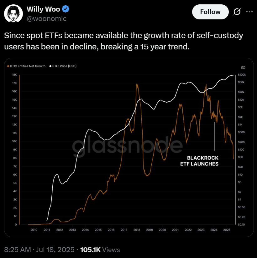 ومع ذلك، فإن صعود صناديق الاستثمار المتداولة للبيتكوين الفورية وحيازات خزانة الشركات يمثل تحديًا لهذا النموذج المثالي، مما يشير إلى تحول نحو أشكال ملكية أكثر تقليدية ووصائية.