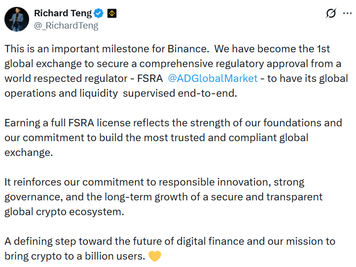 وقال ريتشارد تنغ، الرئيس التنفيذي المشارك لـ Binance، في بيان إن التراخيص توفر الوضوح التنظيمي والشرعية، مما يمكّن Binance من دعم عملياتها العالمية من ADGM.