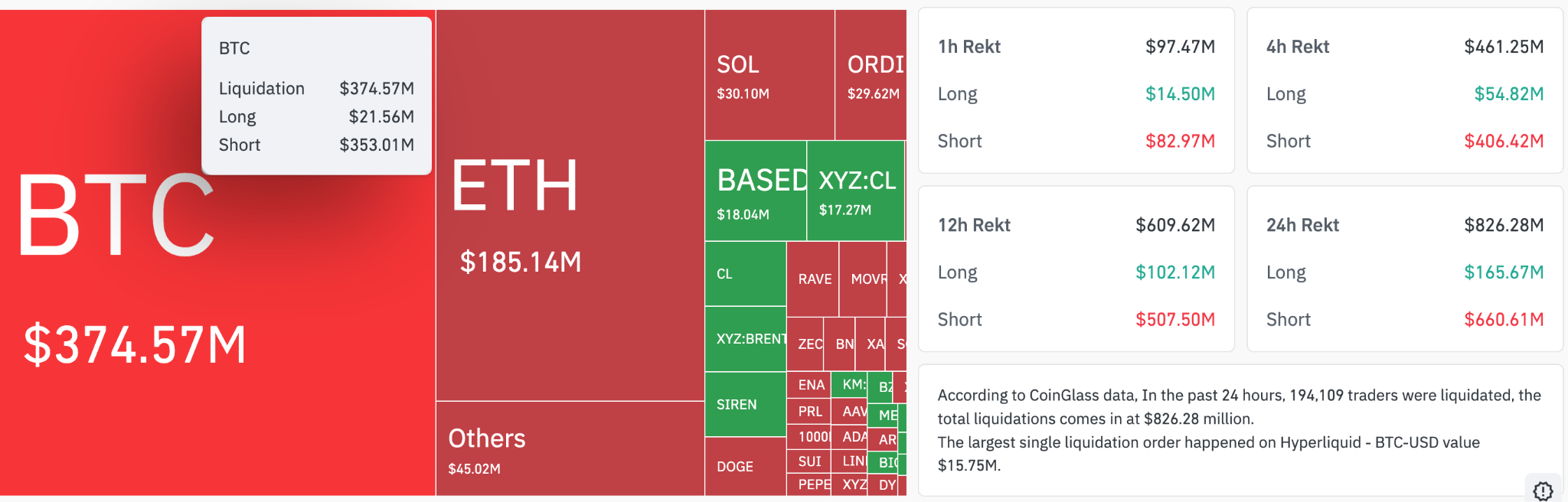 في جميع المجالات، تم مسح 826 مليون دولار من سوق العقود الآجلة خلال الـ 24 ساعة الماضية.