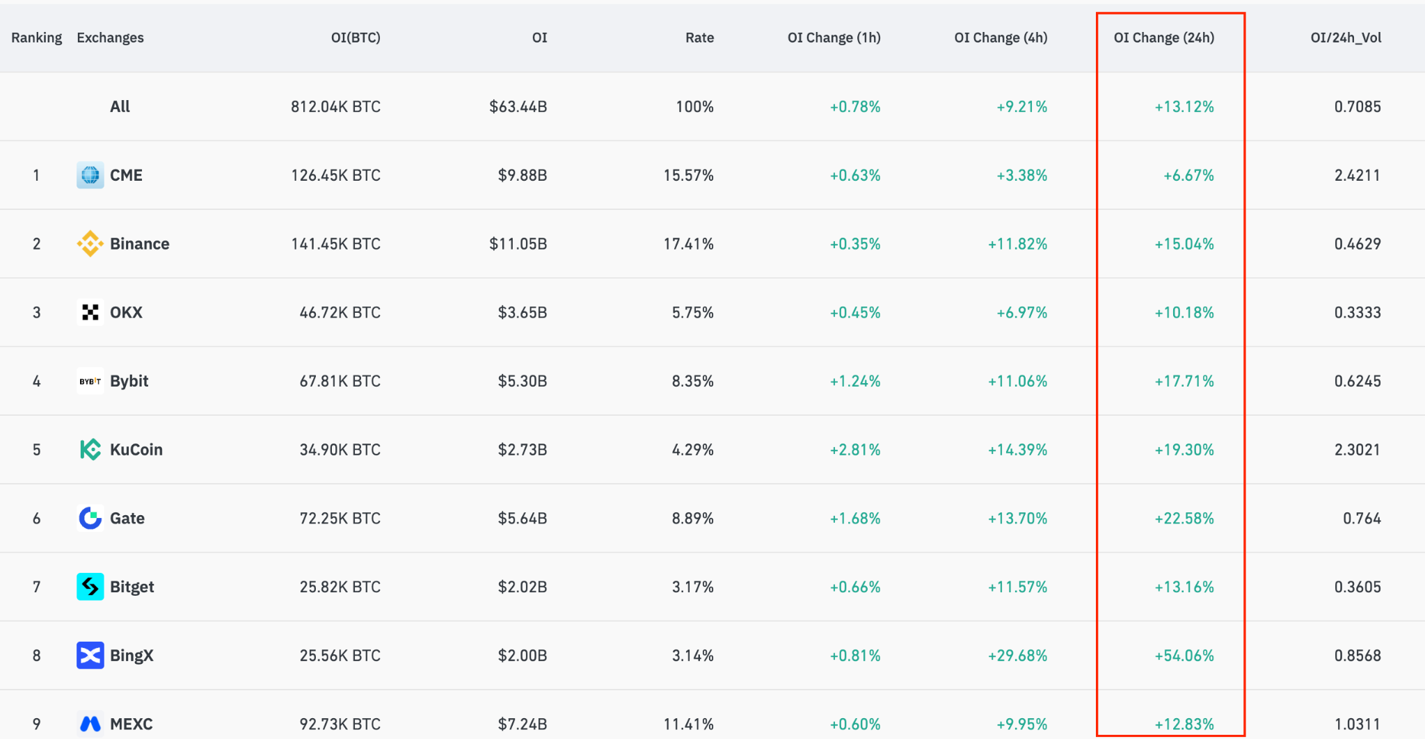 عادةً ما تعمل مجموعات كبيرة من عمليات التصفية القصيرة على تضخيم نطاق ارتفاعات الأصول وأظهرت البيانات من CoinGlass ارتفاعًا بنسبة 13٪ في إجمالي الفائدة المفتوحة لعقود بيتكوين الآجلة (OI) على مدار الـ 24 ساعة الماضية.