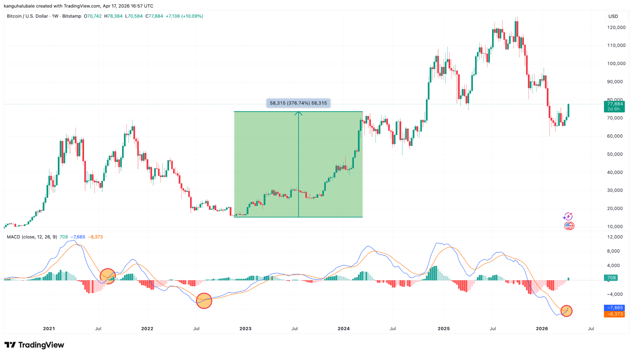 أشار مؤشر تقارب وتباعد المتوسط المتحرك (MACD) لبيتكوين إلى عملية شراء على الرسم البياني الأسبوعي، وهو النمط الذي سبق تاريخيًا ارتفاعات حادة في الأسعار.