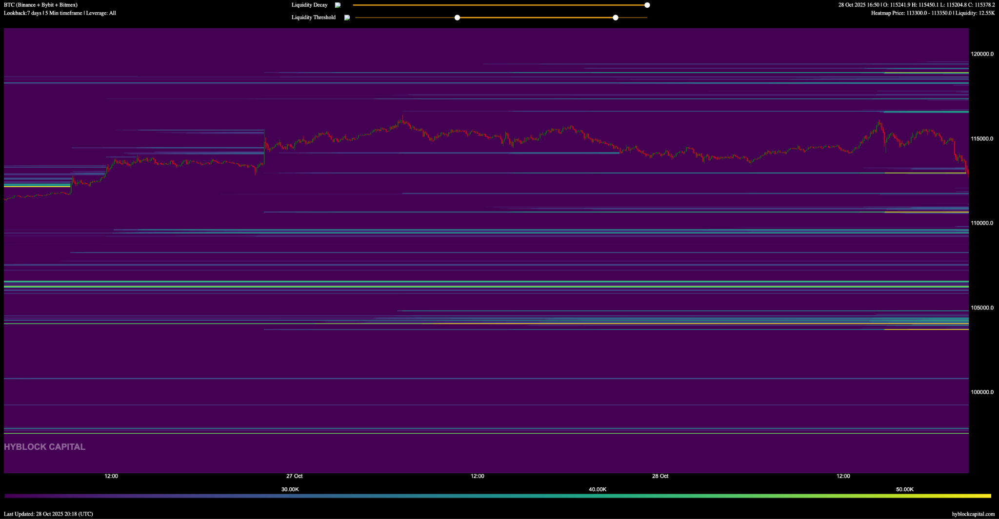 كما هو موضح في مخطط دفتر الطلبات في الجانب الأيسر السفلي، سحب متداولو العقود الآجلة طلباتهم عند 115000 دولار إلى 116000 دولار مع زيادة فرصة الركض على المقاومة، وتجاوزت عمليات التصفية القصيرة 49.83 مليون دولار في الـ 12 ساعة الماضية.