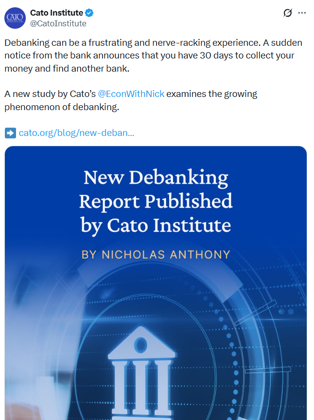 إن غالبية حالات سحب الأموال من البنوك في الولايات المتحدة كانت نتيجة للضغوط الحكومية، وليس سياسات البنوك الفردية، وفقاً لتقرير جديد صادر عن معهد كاتو، وهو مركز الأبحاث الأمريكي.
