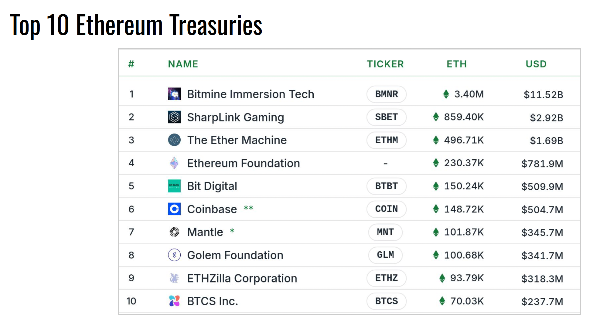أكبر شركة خزانة لـ ETH هي Bitmine، التي تمتلك 3,505,723، أو ما يقرب من 3٪ من إجمالي المعروض من Ether، وفقًا لبيانات CoinGecko.