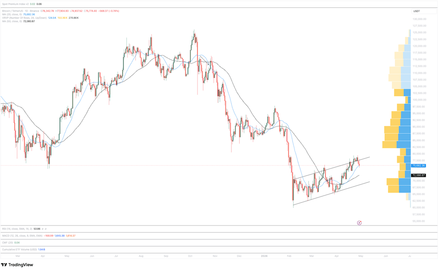 حسبما أفاد كوينتيليغراف يوم الإثنين، بعد كسر فوق مقاومة القناة على الرسم البياني اليومي، تطلبت عملة البيتكوين إغلاق شمعة يومية متتالية فوق خط الاتجاه، متبوعًا بمستوى دعم أقل في نطاق 76,500 دولار إلى 75,500 دولار.
