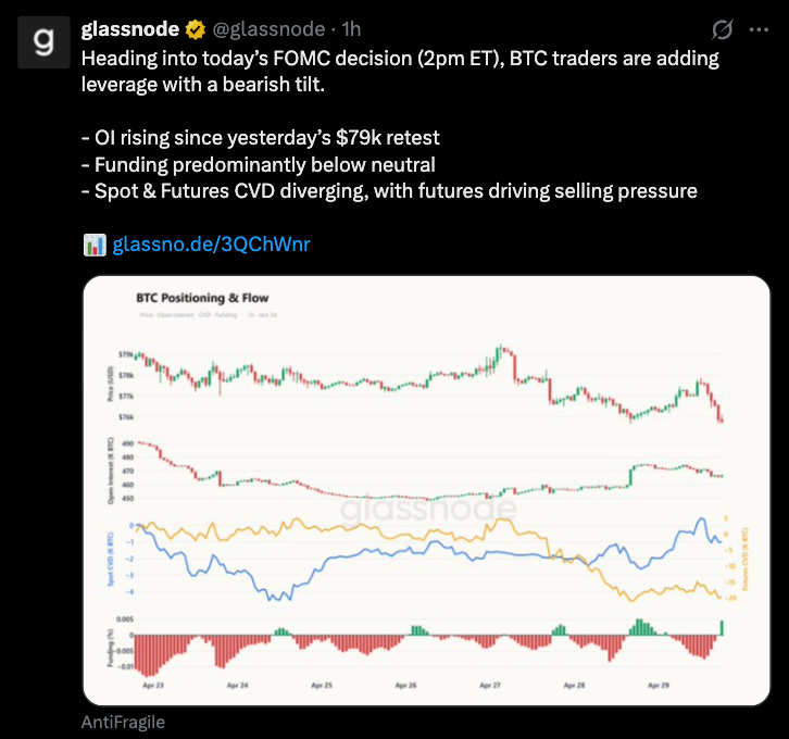 قبل مؤتمر الرئيس باول، لاحظ محللو Glassnode أن متداولي Bitcoin كانوا يضيفون رافعة مالية هبوطية، نقلا عن ارتفاع عقود الفائدة المفتوحة بعد ارتفاع يوم الثلاثاء إلى 79000 دولار، مع بقاء التمويل محايدًا والاختلاف بين دلتا الحجم التراكمي للسوق الفورية والعقود الآجلة (CVD).