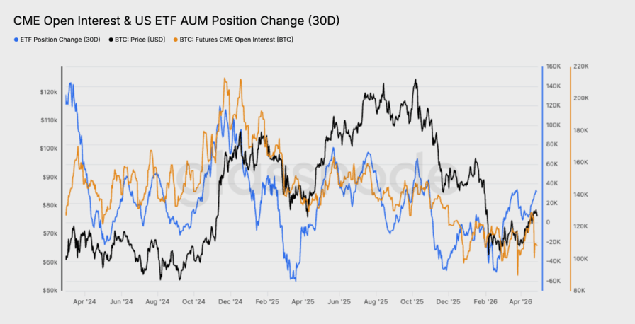 الفائدة المفتوحة في بورصة شيكاغو التجارية، وتغيير مركز الأصول المُدارة لصناديق الاستثمار المتداولة (ETF) الأمريكية. المصدر: غلاسنود