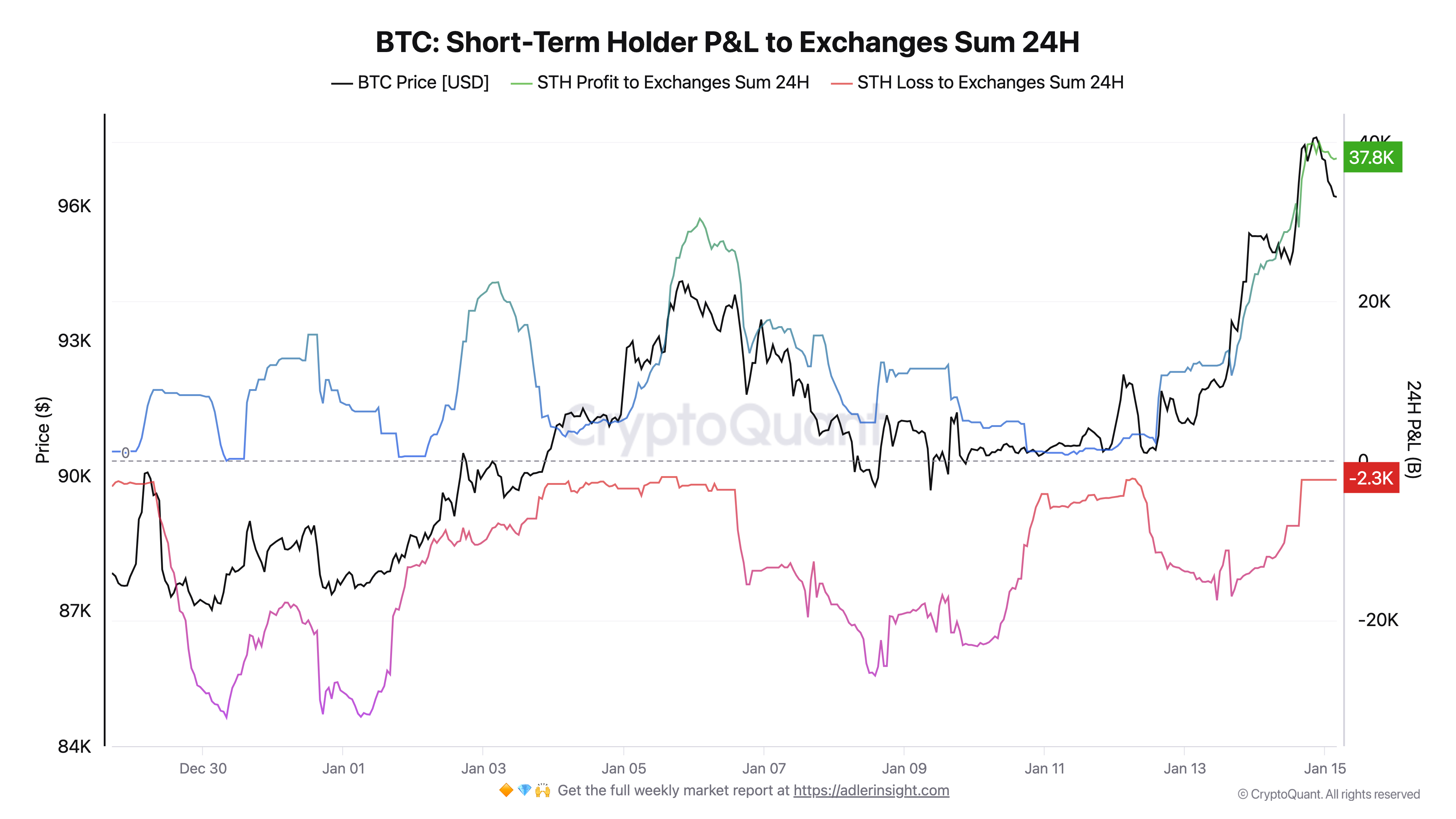 مع وصول السعر إلى أعلى مستوياته خلال شهرين، أرسل حاملو العملات قصيرة الأجل (STHs) – الكيانات التي تحتفظ بما يصل إلى ستة أشهر – 40 ألف بيتكوين إلى البورصات على مدار 24 ساعة.