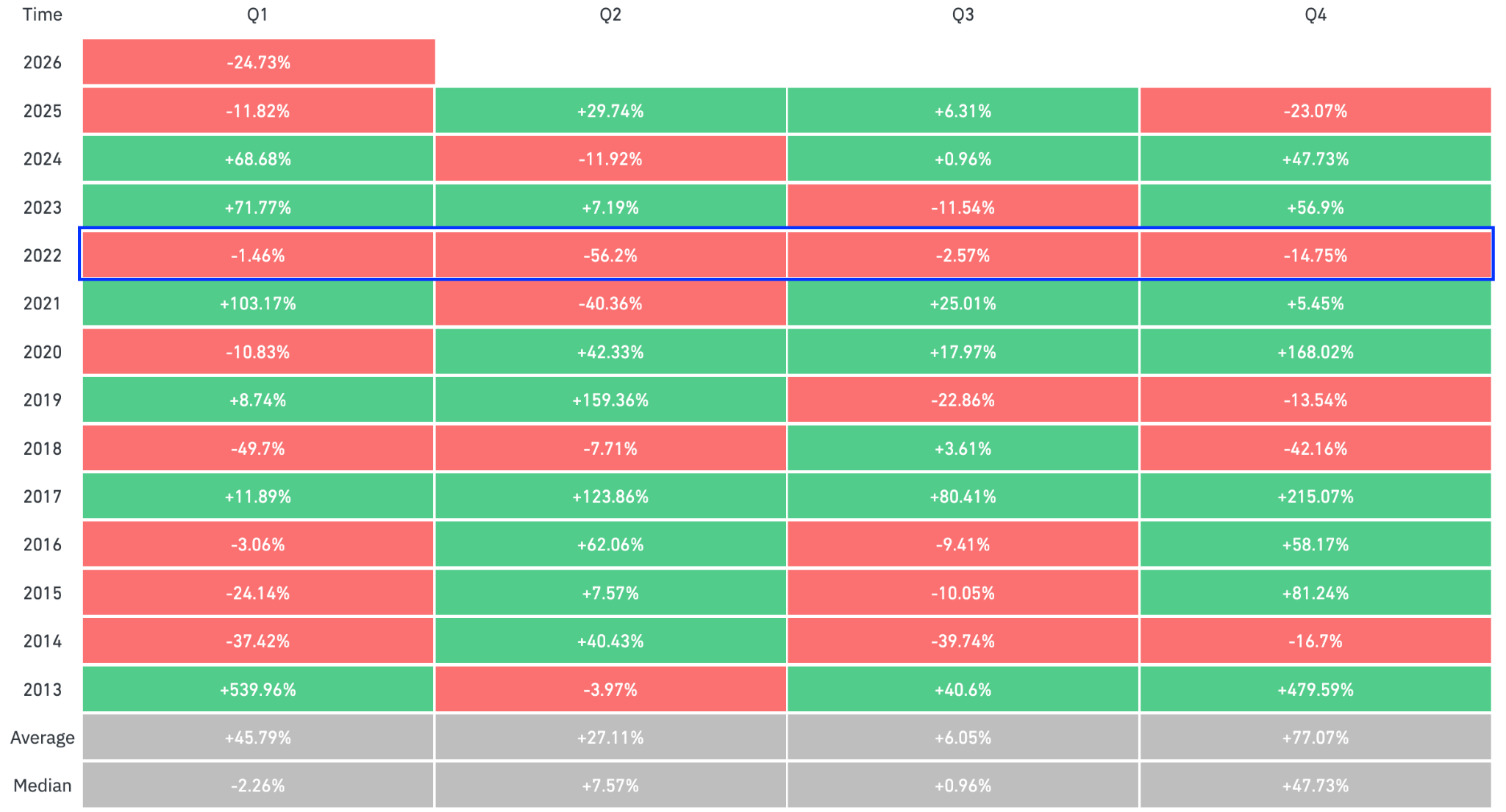 يوفر تحليل أداء Bitcoin الفصلي خلال السوق الهابطة لعام 2022 تفسيرًا أكثر حذرًا لتاريخ أسعار BTC. تظهر البيانات أن بيتكوين سجلت أربعة أرباع حمراء متتالية خلال ذلك العام.