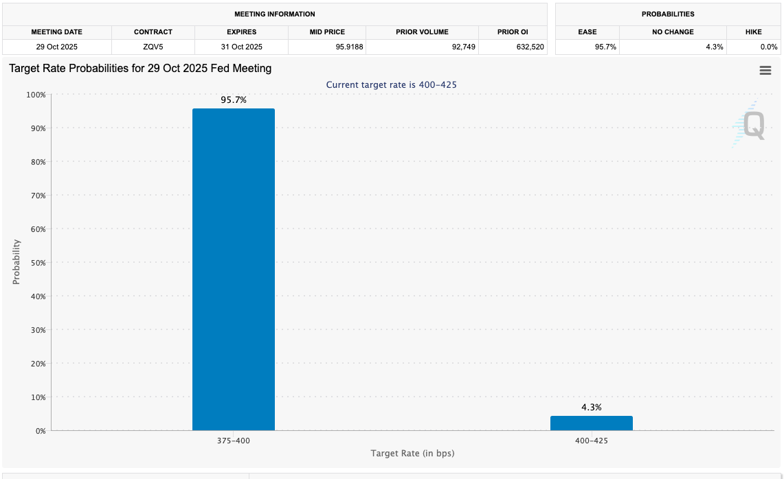 لا تزال التوقعات مجمعة تقريبًا على أن بنك الاحتياطي الفيدرالي سيخفض أسعار الفائدة بنسبة 0.25% في اجتماعه في 29 أكتوبر، وفقًا لبيانات من أداة FedWatch التابعة لمجموعة CME.