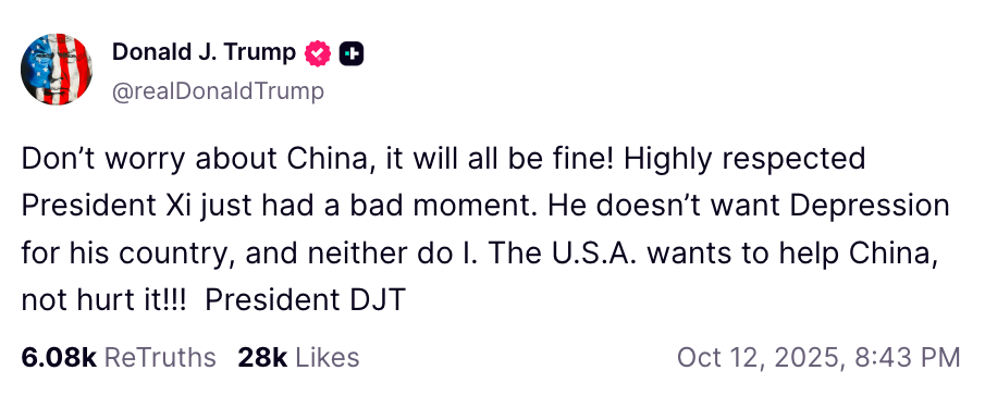“لا تقلقوا بشأن الصين، كل شيء سيكون على ما يرام!” كتب يوم الأحد.