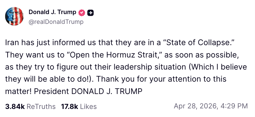 وكتب في منشور على موقع Truth Social: “أبلغتنا إيران للتو أنها في حالة انهيار”.