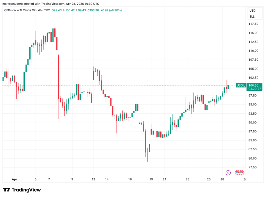 عاد خام غرب تكساس الوسيط إلى 100 دولار للبرميل خلال اليوم، حيث واصل الرئيس الأمريكي دونالد ترامب إبقاء الأسواق في حالة تخمين بشأن نتيجة مأزق هرمز.