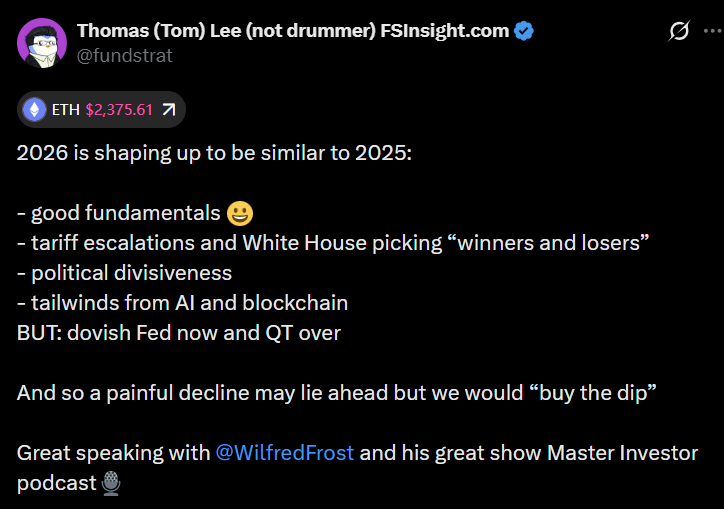 على الرغم من التفاؤل السابق بشأن نهاية عام 2025، حذر توم لي من أن الظروف قد تغيرت، ومن المرجح أن يبدأ عام 2026 بملاحظة “مؤلمة” قبل أي انتعاش محتمل في وقت لاحق من العام.