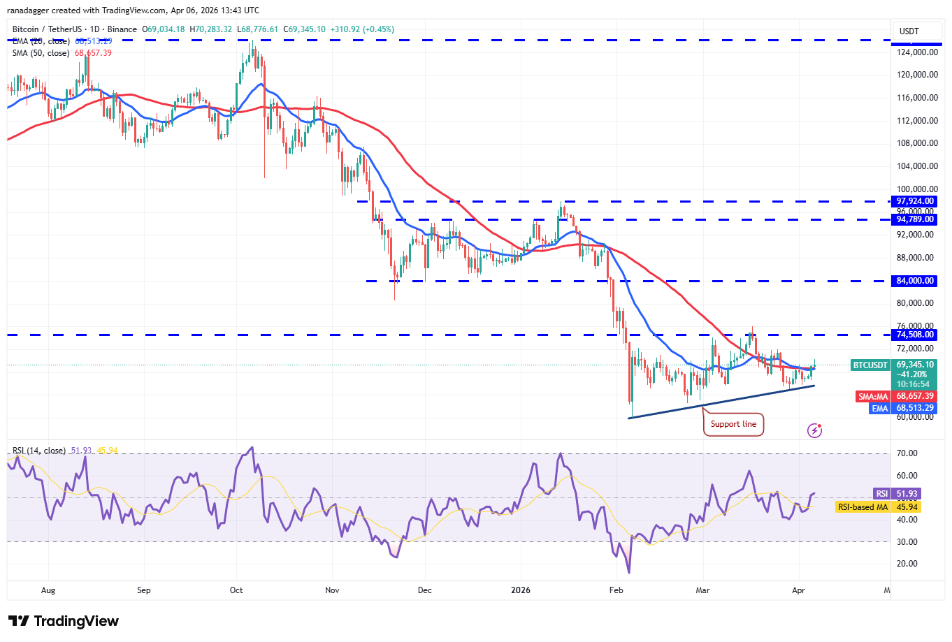 المتوسطات المتحركة المسطحة ومؤشر القوة النسبية (RSI) بالقرب من نقطة المنتصف لا تعطي ميزة واضحة سواء للثيران أو الدببة. إذا استمر السعر فوق المتوسطات المتحركة، فسيحاول المضاربون على الارتفاع دفع زوج BTC/USDT فوق مستوى المقاومة البالغ 72000 دولار. إذا نجحوا، فقد يصل سعر البيتكوين إلى منطقة المقاومة البالغة 74,508 دولارًا إلى 76,000 دولار.