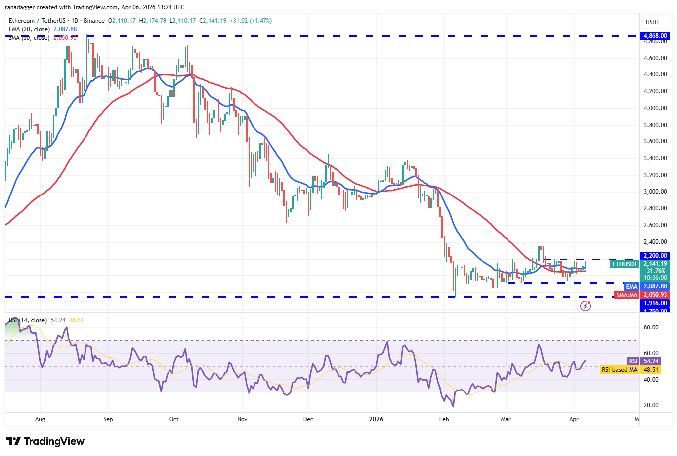 أغلقت عملة إيثريوم (ETH) فوق المتوسطات المتحركة يوم الأحد، مما مهد الطريق للارتفاع إلى مستوى المقاومة البالغ 2200 دولار.