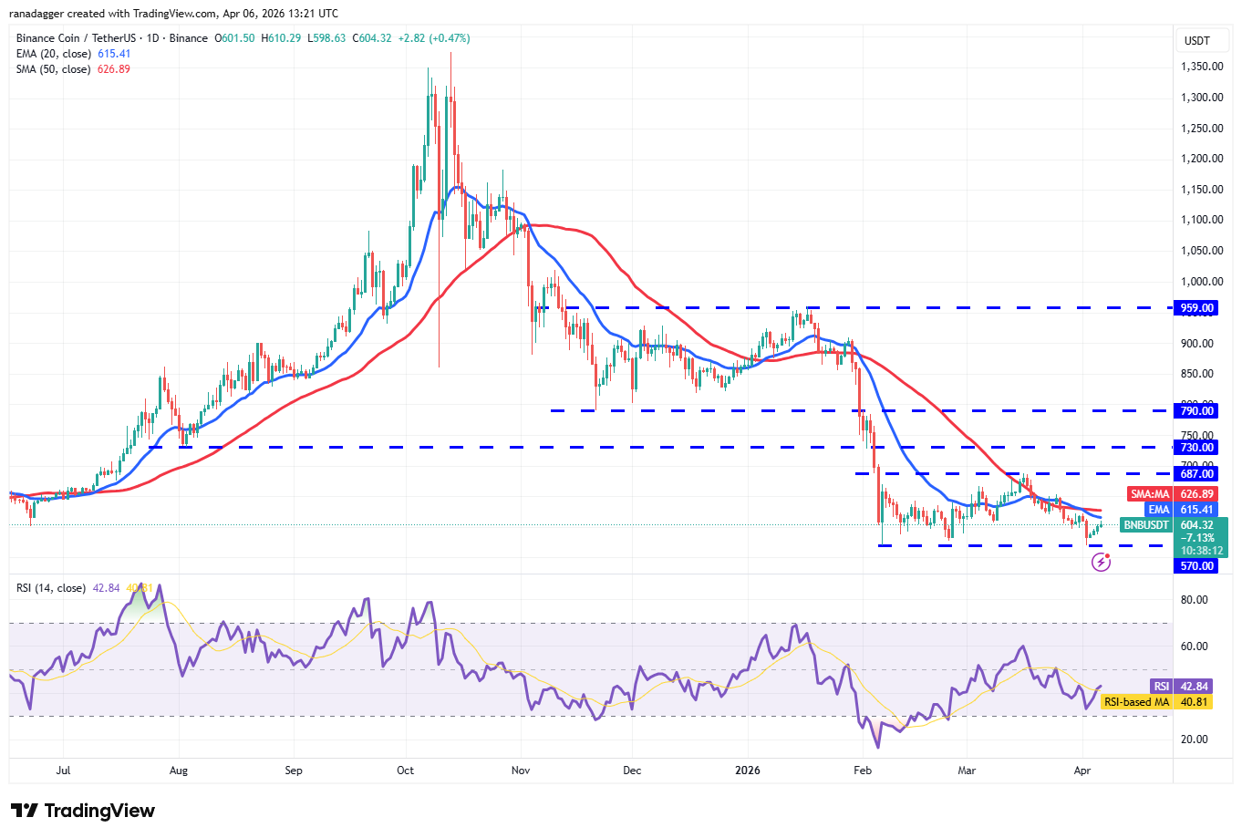 وصل ارتداد BNB (BNB) من مستوى 570 دولارًا إلى المتوسطات المتحركة، حيث من المتوقع أن يتدخل المضاربون على الانخفاض.