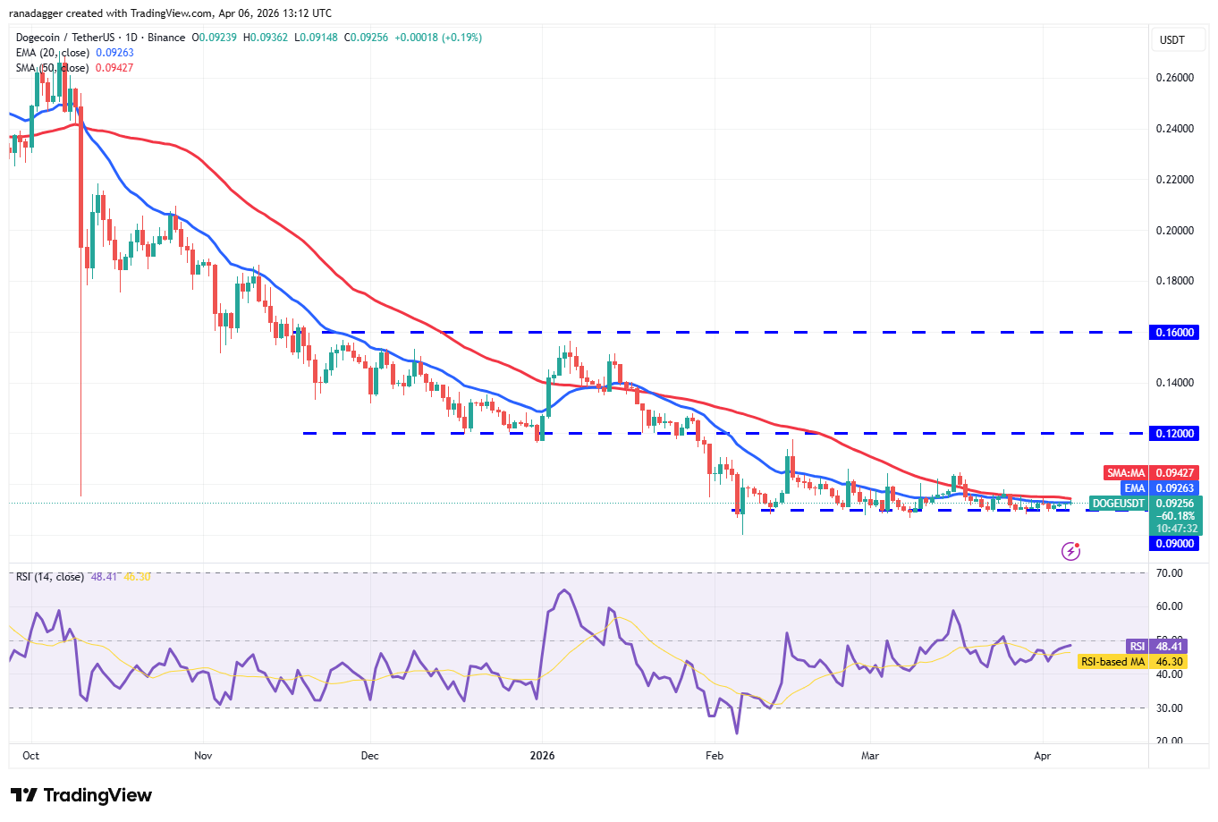 لا تزال Dogecoin (DOGE) عالقة داخل نطاق ضيق بين المتوسط المتحرك البسيط لمدة 50 يومًا (0.09 دولارًا) ومستوى 0.09 دولار، مما يشير إلى التوازن بين العرض والطلب.