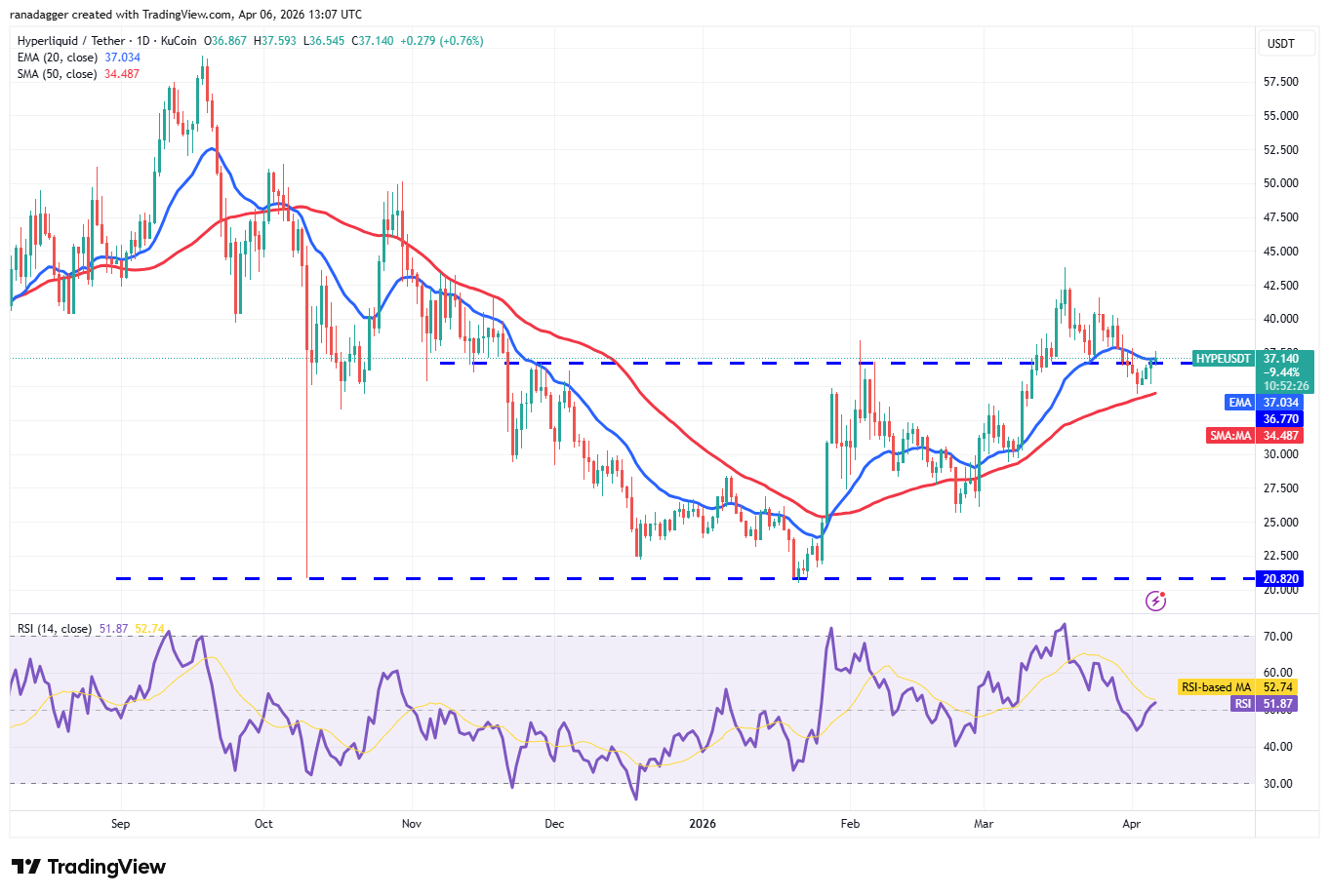 يحاول المشترون الحفاظ على سعر Hyperliquid (HYPE) أعلى من المتوسط المتحرك الأسي على مدى 20 يومًا (37.03 دولارًا) لكنهم يواجهون مقاومة قوية من الدببة.